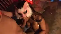 In the heat of passion, their eyes met, each acknowledging the intense desire building between them.She wore a playful kitty mask, teasing him with the idea that it was going to be a night full of fun and surprises.Her long blonde hair cascaded over her shoulders as she approached him, her body oozing sensuality in the skimpy red dress adorned with black lace detailing.With each step closer, he could feel his own passion swell, as he took in her full figure, her tits pushing against the fabric and enticing him beyond imagination.The anticipation of what lay beneath the dress became too intense to resist any further.With a quick yank on the waistband, it was no longer needed, exposing her radiant skin that seemed to glow under the golden hue of the lamp.His eyes locked onto her now naked body, and he could feel his cock stirring at the sight as his hands immediately began to roam, exploring each curve and hollow with fervor.The kitty mask remained on her face, the feline ears tickling his touch as she moved closer still.As they kissed, their lips meeting in a fierce passion, he reached down to unhook her bra, allowing her tits to bounce free, offering themselves to his mouth and hands, each nipple already erect with excitement.With the sensual dance complete, he turned them around to find himself in the perfect doggy-style position.Her body arched backwards, showing off every curve and fold as she bent over, allowing him full access to her glistening wet cunt lips that begged to be penetrated.The kitty mask seemed to grin at their perverse display, an invitation to their animalistic desires that now consumed both their beings.Slowly, his cock head began pressing against her labia, each inch of him yearning for the tight embrace of her cunt walls, feeling her dampness seeping in as he finally breached her opening.With a slow but deep thrust, she felt him take full possession of her, her inner muscles clenching onto every single inch, welcoming the stretch that he brought to her center.He began to move at a steady rhythm, the kitty mask swaying with each powerful motion as their bodies met in harmony and sync, each moan echoing off the walls, drowning them deeper in passion.As they picked up speed and intensity, she found herself reaching for the clit, rubbing it fervently with one hand, while her other was stroking his balls, bringing him closer to the edge.Soon enough, she felt him swell at the end of his cock, signaling that his climax was close.She arched even more, begging for him to push past the limit and send them both soaring into a euphoric bliss.The tension was unbearable as he finally couldnât hold it in any longer, pulling out at just the right moment, sending his hot load splashing against her ass cheeks.With every spurt of cum, she knew the release was complete and they both let out a satisfied sigh as their bodies softened in each other's arms.The kitty mask still on her face, it seemed to grin with amusement at the scene of passion that just unfolded, leaving them spent and satiated as they succumbed to the afterglow of an unforgettable experience.